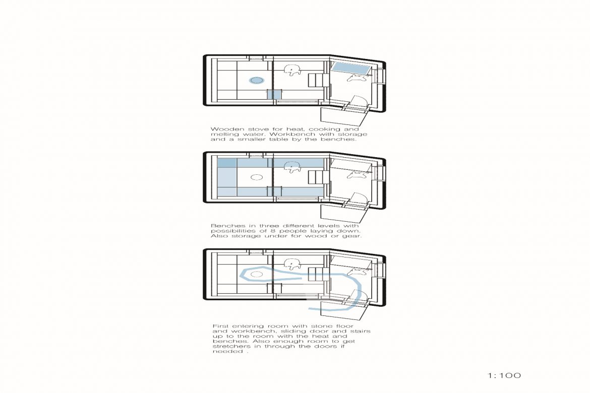 The main shelter has been designed in a way that makes it possible to connect several modules together, as an idea to accommodate different uses, however on this site it should only accommodate for an emergency purpose and not make a large intervention on the landscape.