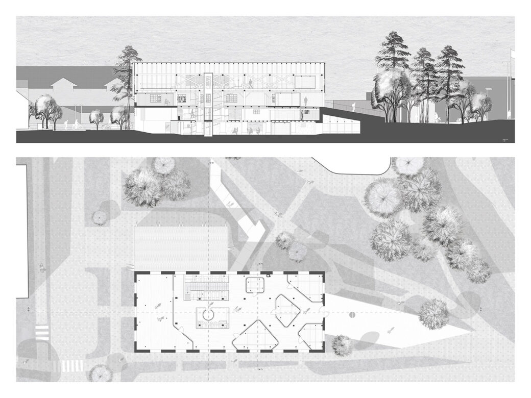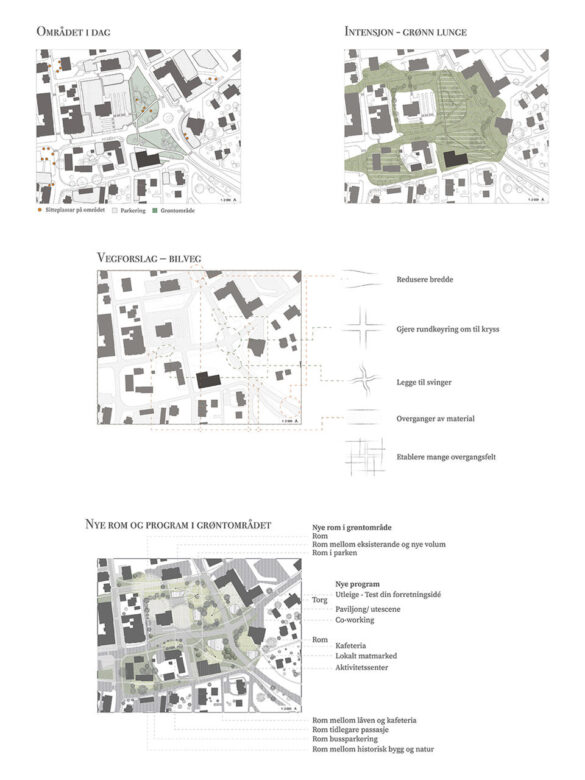 Rundt låven er òg eit grøntområde, som burde blitt utnytta i større grad enn det blir i dag. Dessverre er det slik at dette området har fått mindre aktivitet dei siste åra. Eg kom difor med eit forslag til korleis låven og området rundt, saman kan gje eit nytt tilbod på Nordfjordeid (Figur 4). Låven og grøntområdet har eit stort potensiale til å bli eit bindeledd som skapar samhald i lokalsamfunnet, noko eg ønskte å synleggjere i dette prosjektet. Gjennom å utvikle parkområdet kring låven der ein utvidar parken og etablerer nye volum og program, vil ein invitere meir folk til området (Figur 5). Dette kan gjere parken kring bygget meir attraktiv for fotgjengarar, og slik vil fleire oppdage og oppsøke aktivitetssenteret.