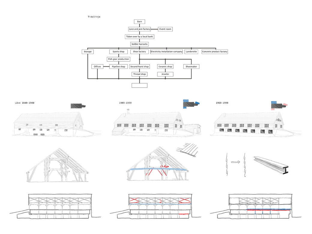 Låvar er ofte større bygg som gjer at dei har noko redusert kapasitet til å få inn dagslys. Å skape atmosfærar i bygget der ein spelar på overgangar mellom mørke og opplyste soner, kan vere eit element som skapar spenningar og skuggespel mellom det eksisterande og det nye (Figur 9,11,12).