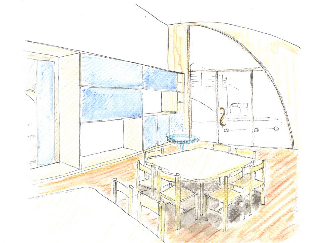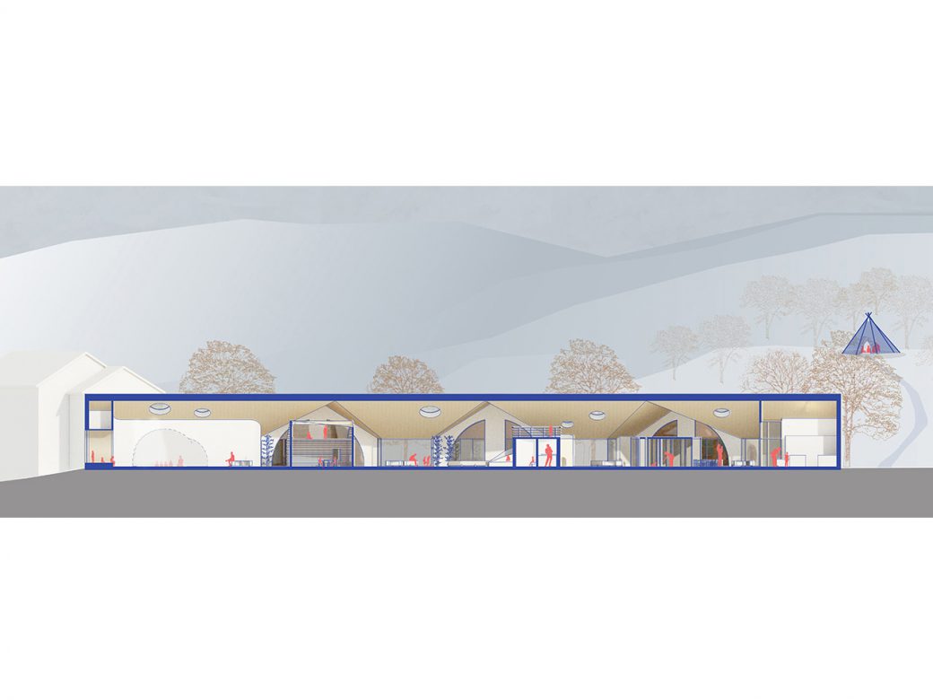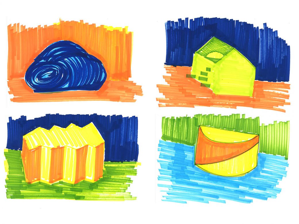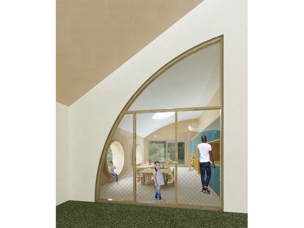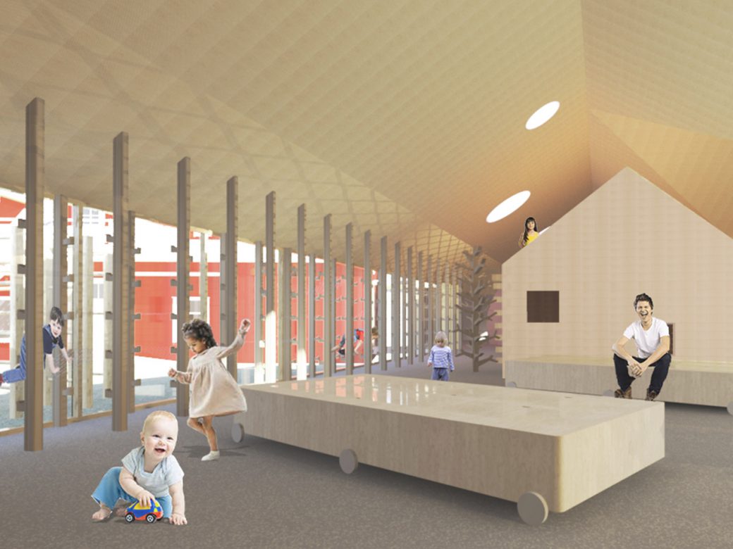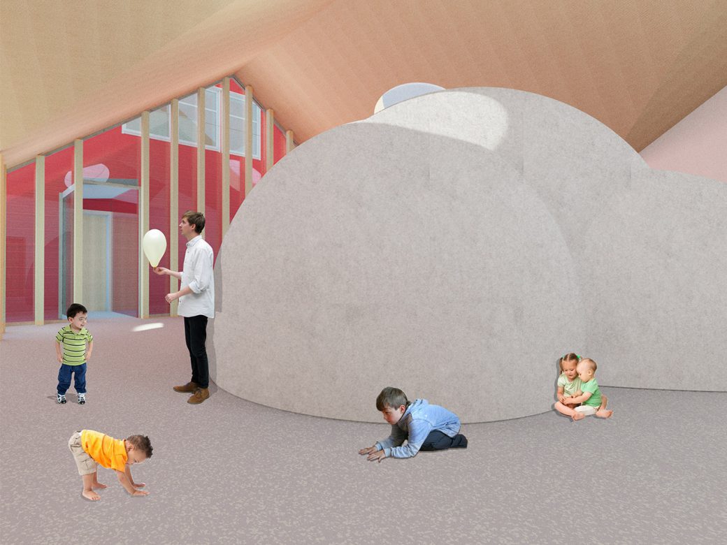 I am also introducing “Four characters” in the common area. Four small buildings in the building, each with their own character, both in form and use of material. In this way, the children are exposed to a variety of forms and materials. Moreover, the buildings give identity to space around which helps the children to navigate