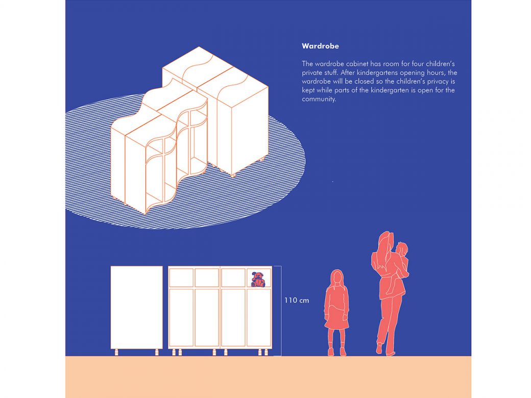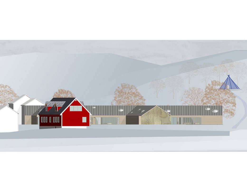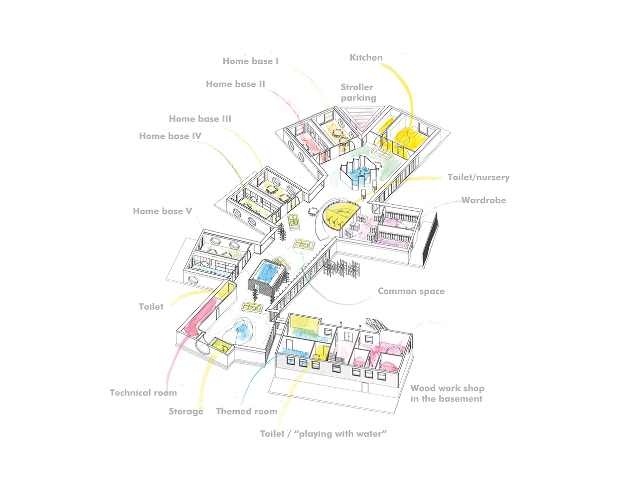 The kindergarten is a “home base” based kindergarten, where a smaller group of children is assigned to one space and sharing common space for play and themed rooms. A condition from the Bergen Municipality is that Kindergartens built today should also have a function after kindergartens opening hours, moreover, be flexible in the sense that if the kindergarten would close it would be possible to use the building with a different program. In this kindergarten, the main body of the building would be open for events for the community after kindergartens openings hours. The home bases and themed rooms is placed in such a way that it is easy to close off, and still provide a quality space for diverse activities for the community.