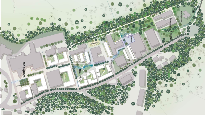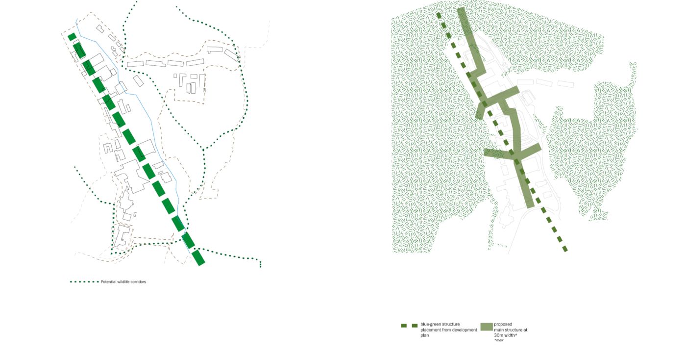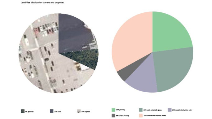 The site of Spelhaugen is currently a low- intensity office-light industrial estate with a small shopping centre. Many of the office buildings are near empty, and some businesses are light industrial. The KPA 2018 states that within the densification areas (BY2), such businesses are not permitted. 7 areas were designated to house all future space-greedy activity; some of which directly impacts virgin land of high ecological value. Letting the current businesses stay on site at Spelhaugen provides activity in a proposed new neighbourhood, and the left-over structures may transform to either more housing, new commercial use or community- serving functions.