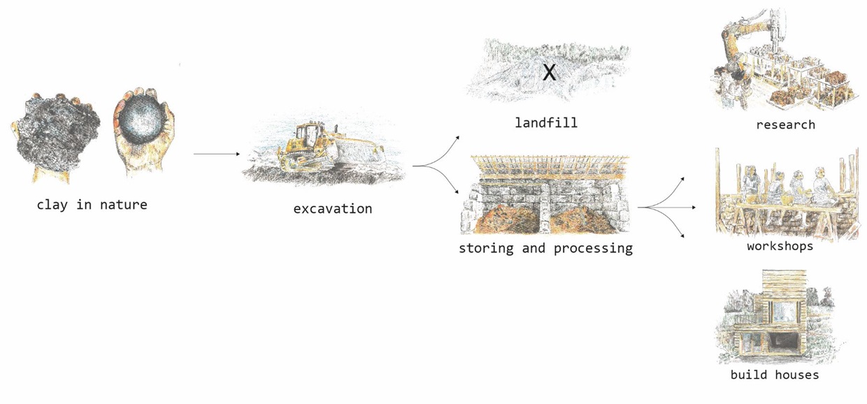In order to build, a material needs to go through several stages from taking it out of its original ecosystem to making and using the material. If we look at the steps clay needs to go through in Norway, we can understand why it has not been used in the contemporary building industry. Our project will be a center which tries to link the gaps in this chain.