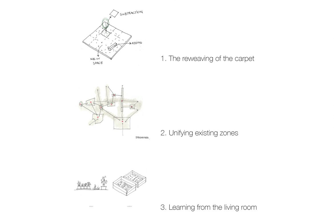 - The carpet, the materials of the ground, is today well designed as a “Hollywood carpet” with the purpose of getting someone from point A to point B, but how can this existing carpet interact with the idea of the “living room carpet”, the carpet that we gather around? The reweaving of the carpet, existing and new materials woven together, will create a pattern of new ways of motion.