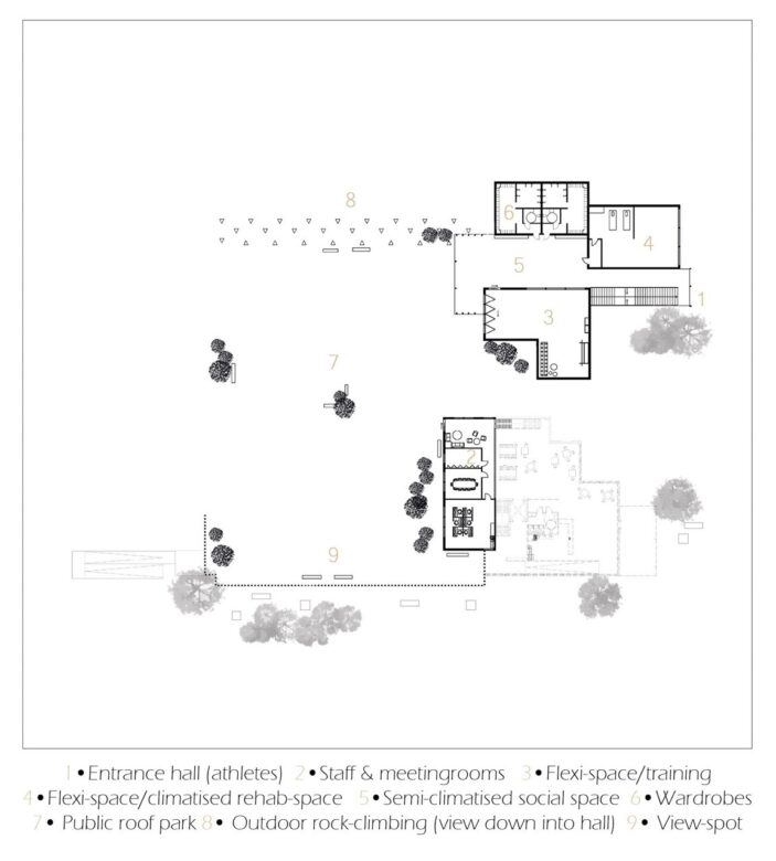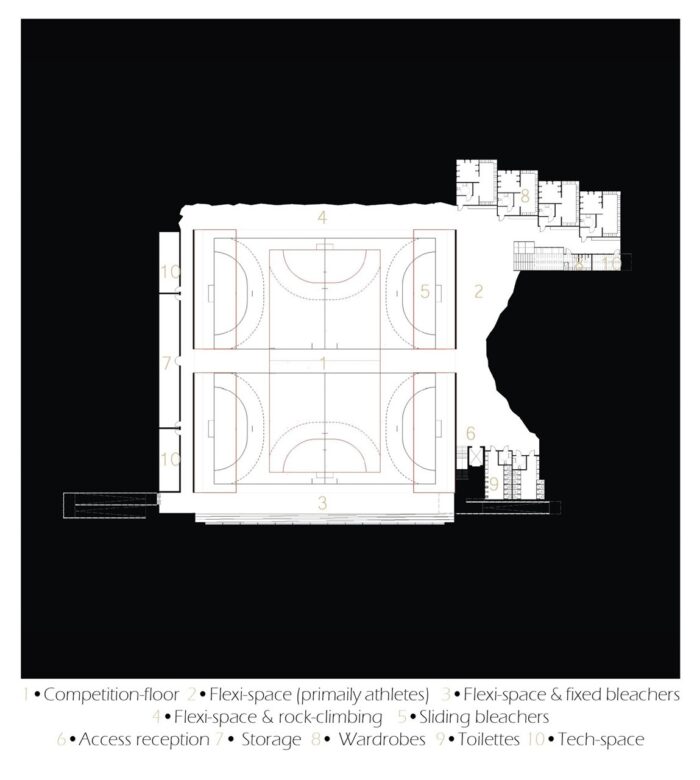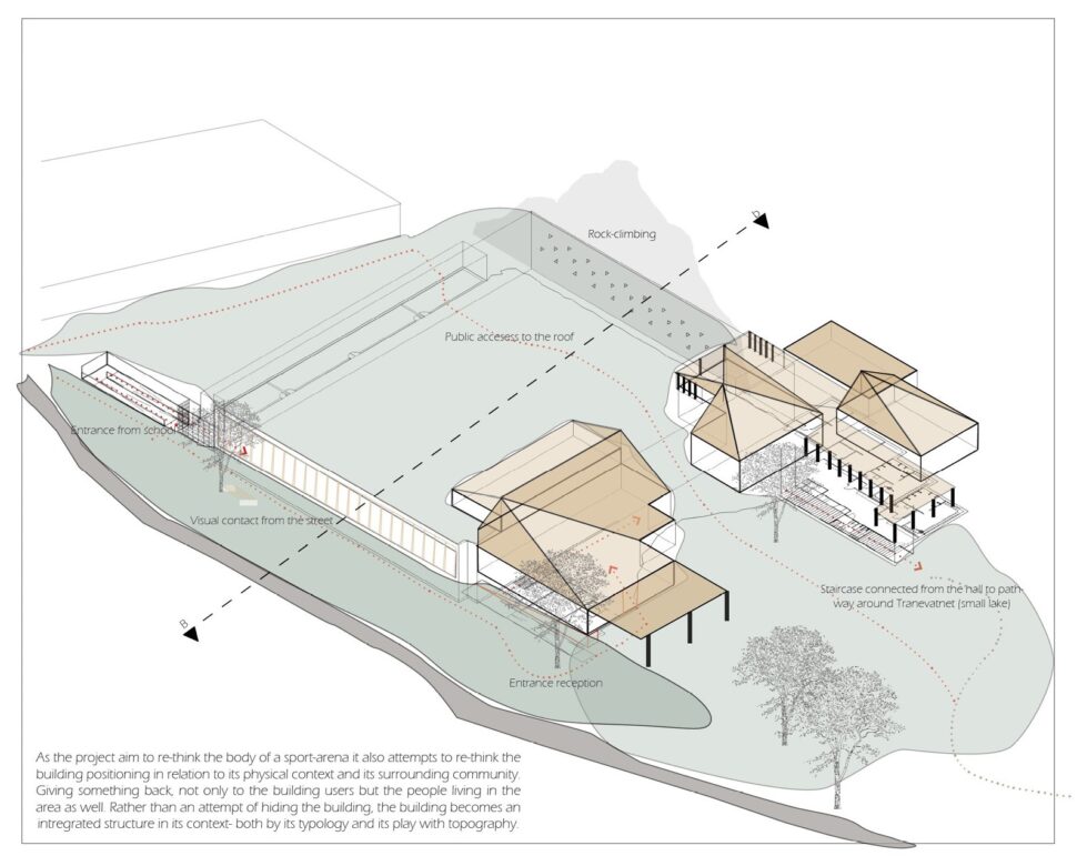 As a professional athlete I would wish that the importance of the space surrounding the competition-floor: the corridor, the wardrobe, toilettes, the reception area, common areas, the warm-up space, other training rooms, staff space, and outdoor space, is re-evaluated. As an architect I set out to do this. I aim to re-think the sport-arena as more than just a one-dimensional space, more than this introvert building with little or no immediate relation to its physical context, to view its inside and outside spaces and its use as a living thing.