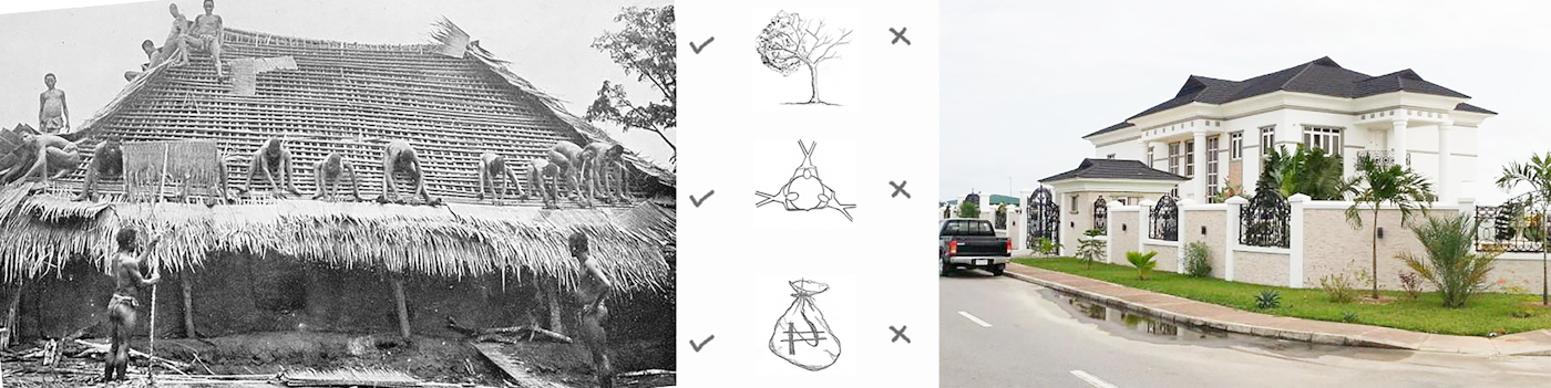urban context: Starting from a macro level of understating how the community was set up originally. Traditionally in the Igbo community settings, the transitions from public to private spaces were more gentle as boundaries were marked with natural and open elements like trees. This consequently created good social communications and spaces. The environment was also much more greener, as the major occupation was farming. Trees were also part of the space composition ,either for space definitions or for creating shades for the hot climate. Today, with urbanity encroaching even into the village settlements, these qualities are fast been lost. Fence walls made of cement blocks are now used to define the boundaries, making the transition so sharp. Strong and rigid grid patterns of private property development, has also set in. Reducing spaces left for public/social use. With this urban developments growing very fast, the green areas are also fast disappearing, making the environment less climatically comfortable and safe.