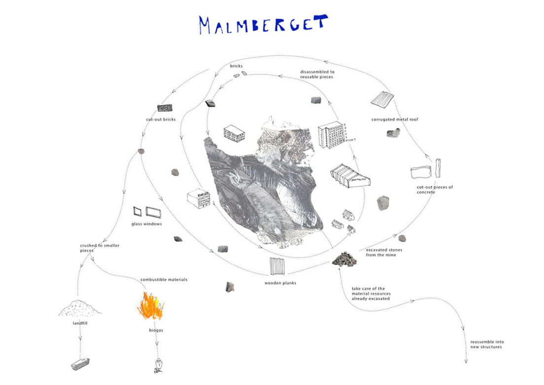 WHAT: The project is three interventions, situated in and around Malmberget and Gällivare – exposing three different ways that we domesticate nature. The interventions are materialized by using both material from the soon-to-be demolished buildings in Malmberget and excavated stone – a waste product of the mining industry, assembled together with a few newly produced pieces, aiming to blur or blend the two together. By shapeshifting the building material which would otherwise get burned up or become landfill, Malmberget can continue to live on, as a glitch. Holding the memories of a place that once existed. Together with an established path between the interventions, creating new pathways and connection points in the landscape disrupted by humans.