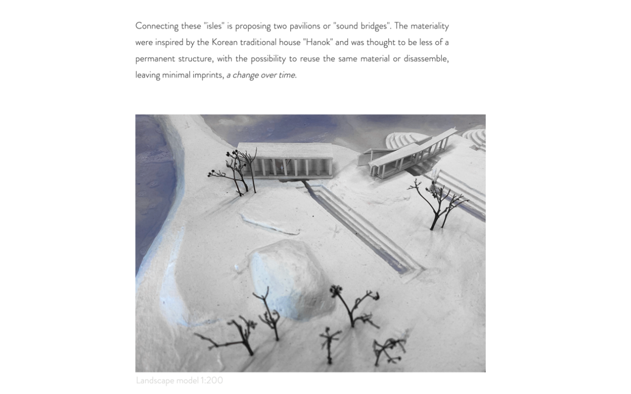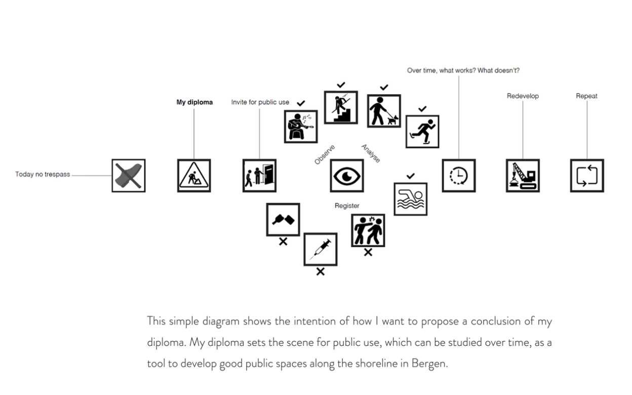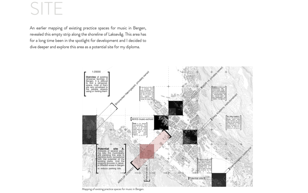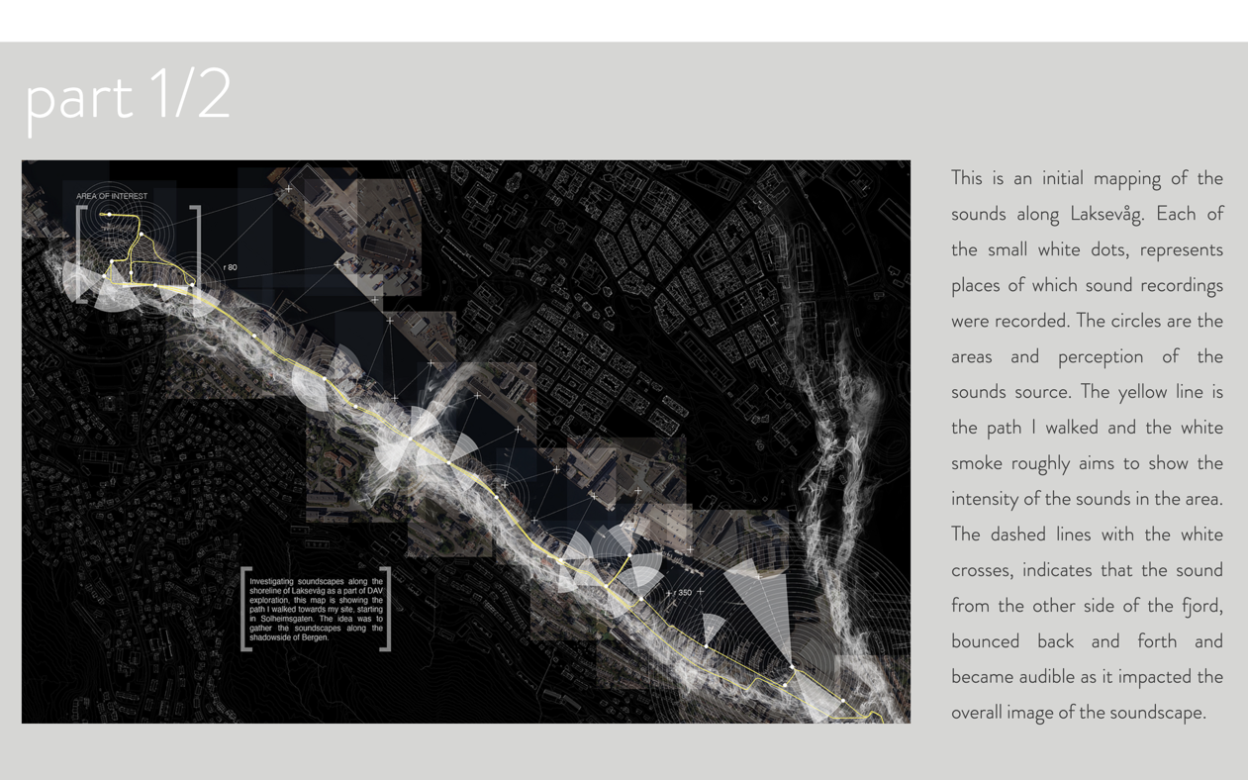 The personal motivation for the diploma was to follow my instinct to work with sound. I wanted to take this opportunity to celebrate my final project as a student, as this might be the last. I didn’t know where this project would end up, and it took some unexpected turns. This resulted in my diploma to investigate a method of using sound to draw, develop form and as a source of inspiration and to discuss development along the shoreline in a larger context. However I still wanted to come up with a proposal and get as far as possible with the time I had and the project concludes as a comment on how we can better plan the way we develop by the shorelines in the city of Bergen through the practice, time and sound.