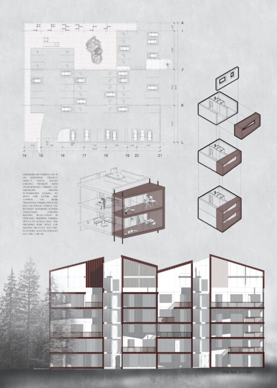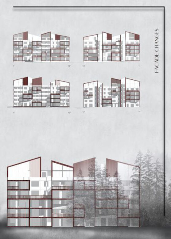 How? The project is based on real life situation weighing out potential problematics. The existing values and qualities of the location were established on the way and became the main aspiration for the project itself. Proposal does focus on different scales from macro to micro taken under consideration different aspects: from country to city, to district, to neighborhood, to building block, to apartment. Also reflecting on the scales of the communities along side from nation to community, to collective, to household, to the person.
